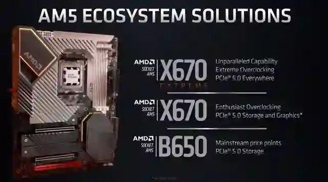 新的主板分为三种 X670 Extreme、X670 以及 B650。X670 Extreme 将面向极限超频爱好者,性能最强。X670 和 B650 也都会支持 PCIe 5.0。这些主板与锐龙 7000 处理器将会在今年秋季推出。
