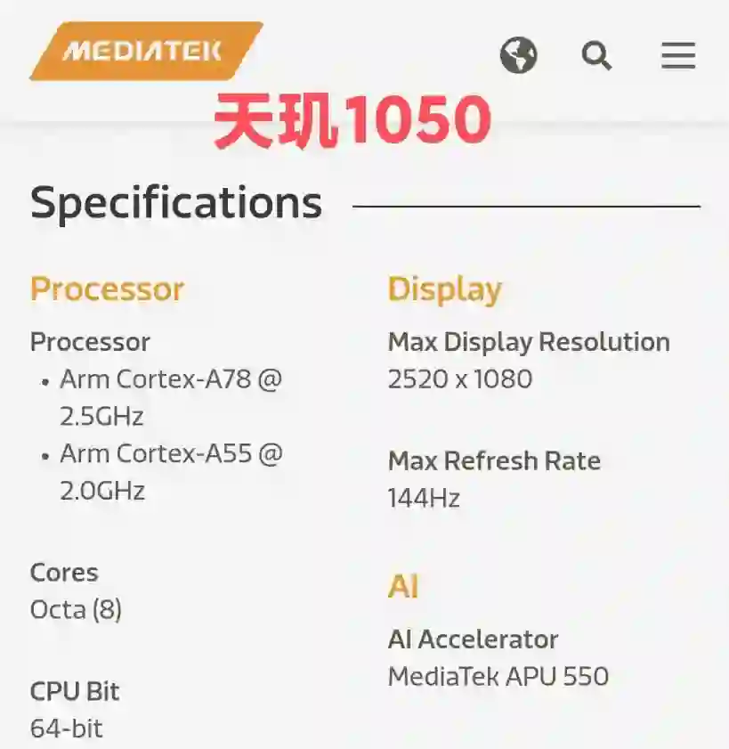 其它规格方面,天玑 1050 支持 LPDDR5 内存和 UFS 3.1 闪存,屏幕最高支持 FHD+ 144Hz 高刷新率的显示效果,无线 Wi-Fi 支持 Wi-Fi 6E 2x2 MIMO 连接。