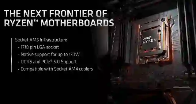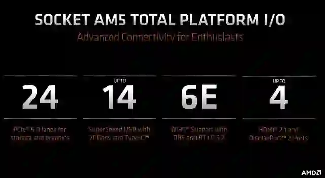 这次 ZEN4 也将升级插槽,从 AM4 升级到 AM5,采用 LGA 1718 插槽,支持 PCIe 5.0 和 DDR5,兼容 AM4 时期的散热器。AM5 将提供 24 条 PCIe 5.0 通道,4 个 USB 3.2 20Gbps 接口,支持 Wi-Fi 6E 和蓝牙 5.2,HDMI 2.1 以及 DP 2.0。