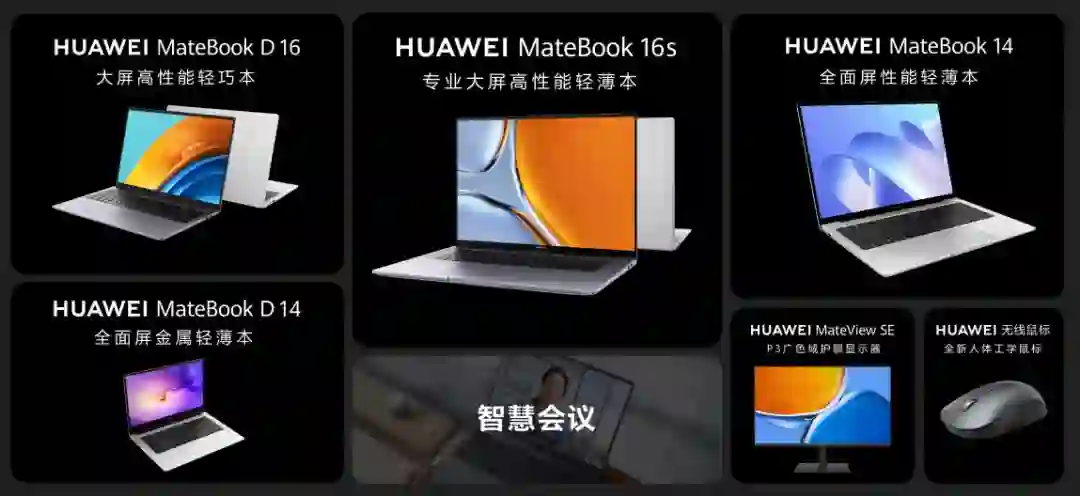 华为 MateBook 系列新品发布会如期召开,全球首款 i9 Evo 认证笔记本电脑华为 MateBook 16s i9 版本、华为首款大屏高性能轻巧本华为 MateBook D 16、华为 MateBook 14、华为 MateBook D 14、华为显示器新成员华为 MateView SE 以及全新华为无线鼠标同台发布。