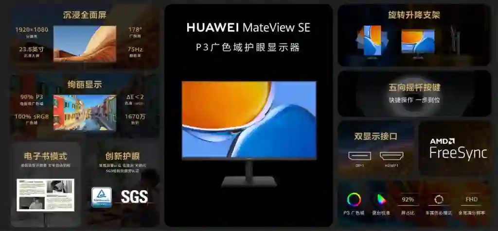 作为一款千元档位内显示器,华为 MateView SE 鲜有地支持了 P3 广色域。它的尺寸为 23.8 英寸,1920*1080 分辨率,90%,P3 广色域,△ E<2 色准,通过德国莱茵低蓝光、无频闪双重认证,并拿到了全球首张由中国标准版研究院与 SGS 联合颁发的显示器品类低视觉疲劳认证。