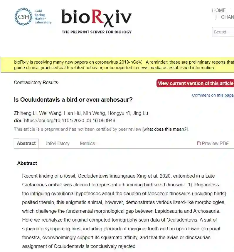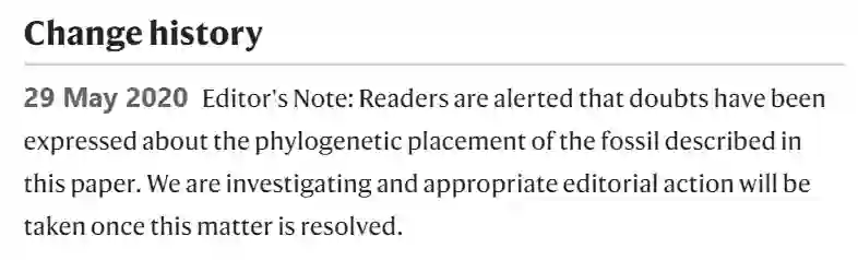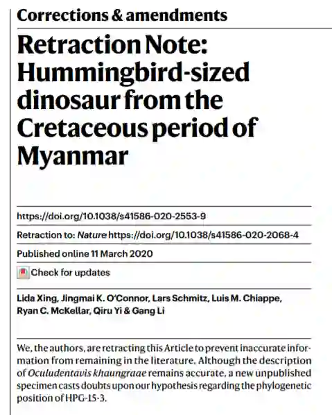 “我们作为作者,现撤回这篇论文,以免不准确的信息继续留在文献中。尽管对宽娅眼齿鸟(Oculudentavis khaungraae)的描述仍然是准确的,但一个新的尚未发表的标本给我们有关 HPG-15-3 的演化树位置的假说带来了疑问。” (We, the authors, are retracting this Article to prevent inaccurate information from remaining in the literature. Although the description of Oculudentavis khaungraae remains accurate, a new unpublished specimen casts doubts upon our hypothesis regarding the phylogenetic position of HPG-15-3.)