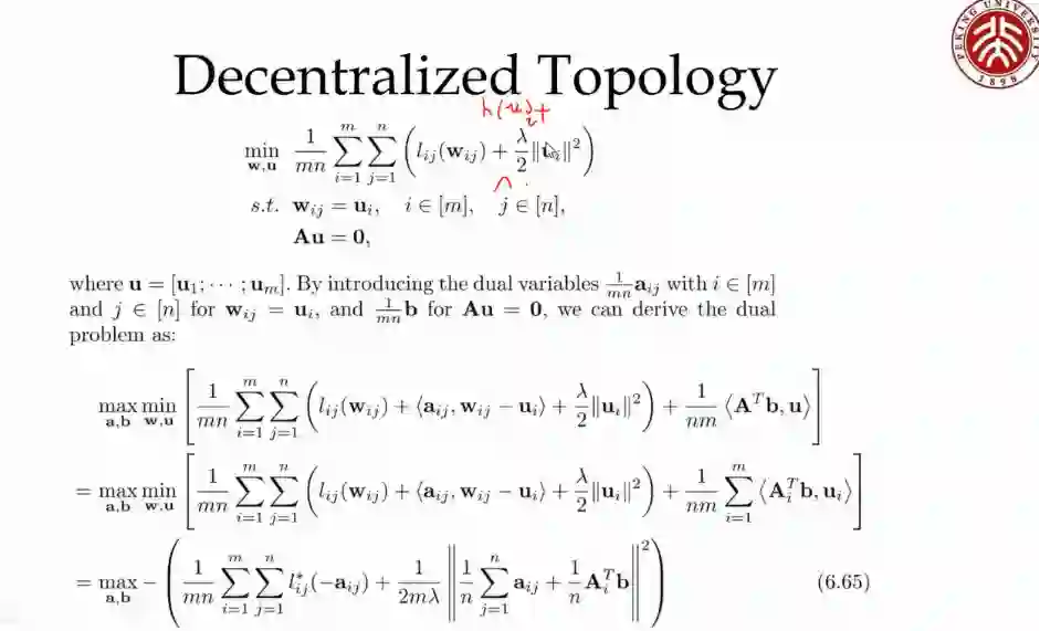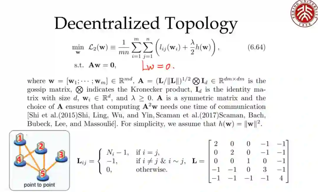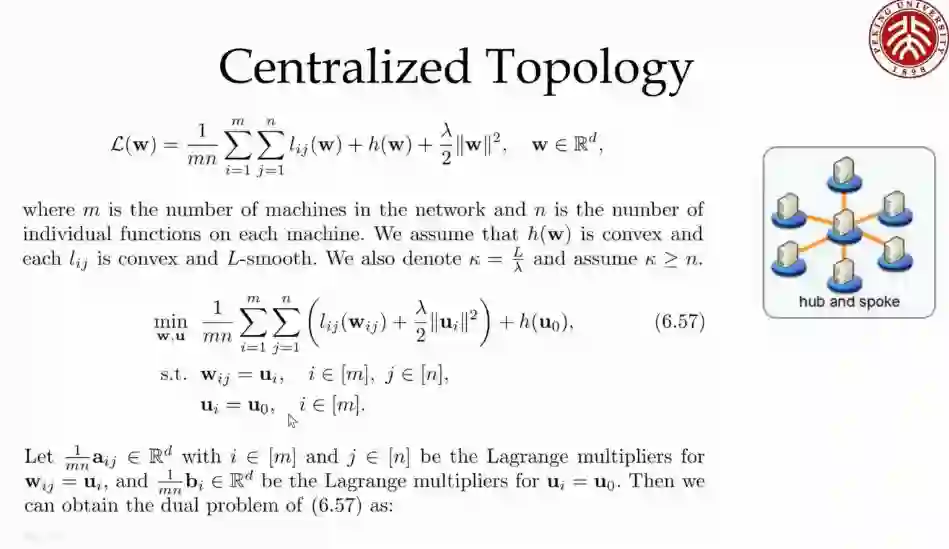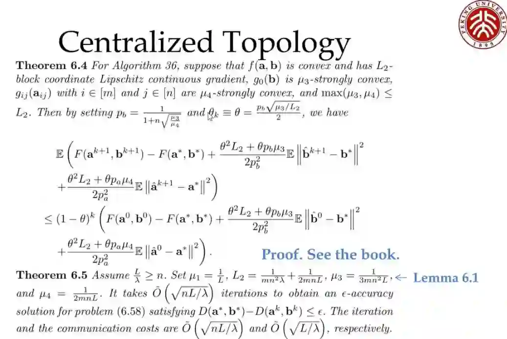 然后,林宙辰教授开始就分布式算法的中心化和去中心化两种基本实现方式,详细讲述了中心化算法实现以及随机通讯设定下的加速算法,并展示了它们的收敛性质和计算复杂度分析中的关键性步骤和引理。