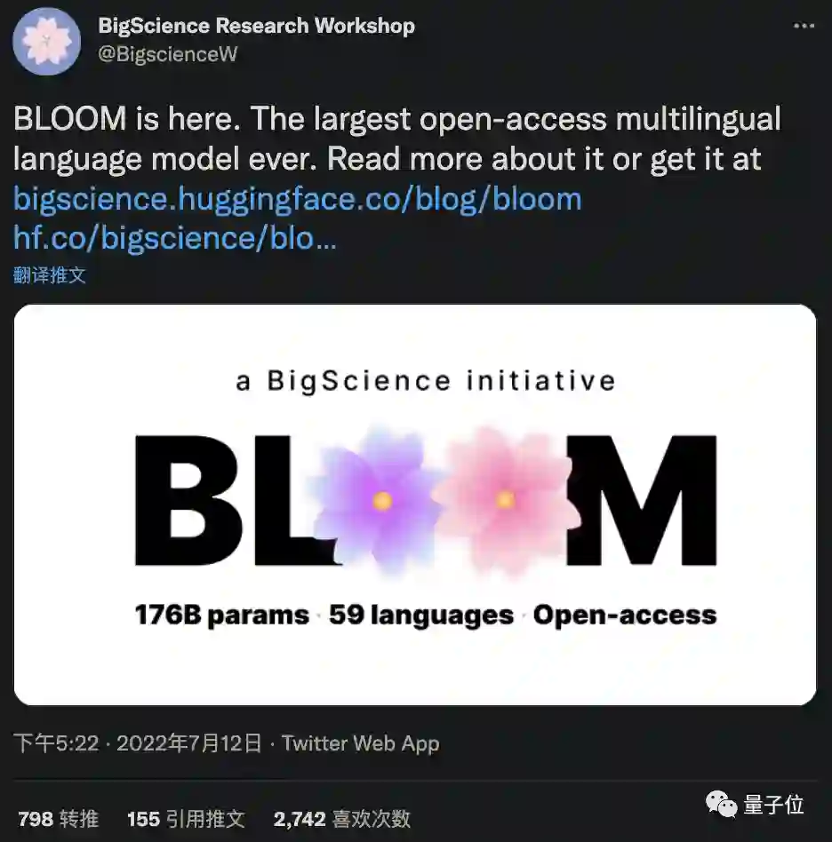 它的名字叫BLOOM,参数1760亿,不光支持英文或者中文,连西班牙语、法语等59种语言都支持,是目前最大的多语言开源语言模型。