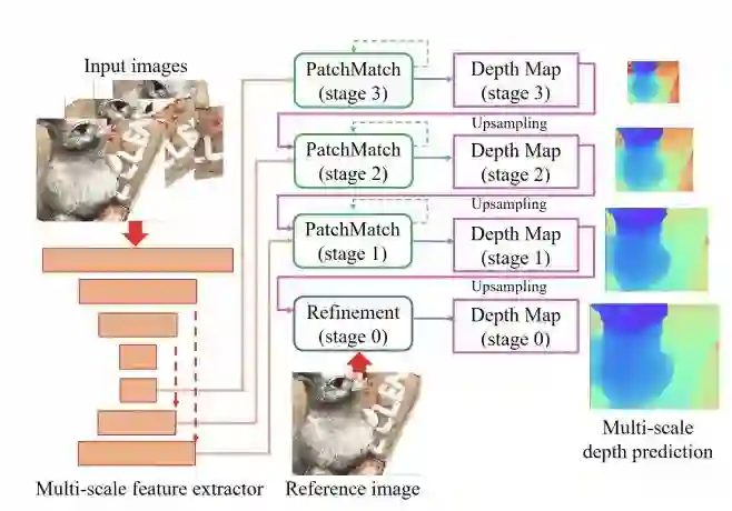 PatchmatchNet,这是一种适用于高分辨率多视图立体声的Patchmatch的新颖且可学习的级联公式。与采用3D成本正则化的竞争对手相比,PatchmatchNet具有较高的计算速度和较低的内存需求,可以处理更高分辨率的图像,并且更适合在资源受限的设备上运行。本文首次在端到端可训练体系结构中引入了迭代的多尺度Patchmatch,并针对每次迭代使用了一种新颖且学到的自适应传播和评估方案来改进Patchmatch核心算法。