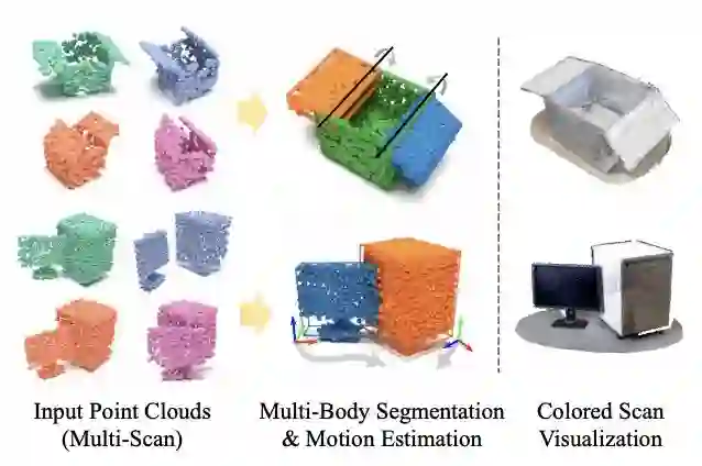 本文介绍了MultiBodySync,这是一种新颖的,端到端的可训练多体运动分割和针对多输入3D点云的刚性配准框架。本文所研究的这种多扫描多体设置所带来的两个非同寻常的挑战是:(i)保证捕获多个不同身体或身体部位空间布局的多个输入点云之间的对应关系和分割一致性;文章提出了一种解决这些问题的方法,该方法将频谱同步合并到迭代的深度声明式网络中,以便同时恢复一致的对应关系以及运动分割。该方法可有效用于各种数据集,从关节物体的刚性零件到3D场景中的单个移动物体,无论是单视图还是全点云