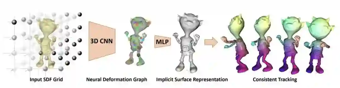 本文引入了神经变形图,用于全局一致的变形跟踪和非刚性对象的3D重建。具体来说,本文通过深层神经网络对变形图进行隐式建模。该神经变形图不依赖于任何特定于对象的结构,因此可以应用于一般的非刚性变形跟踪。实验表明,该神经变形图在质量和数量上都优于最新的非刚性重建方法,重建性能提高了64%,变形跟踪性能提高了62%。