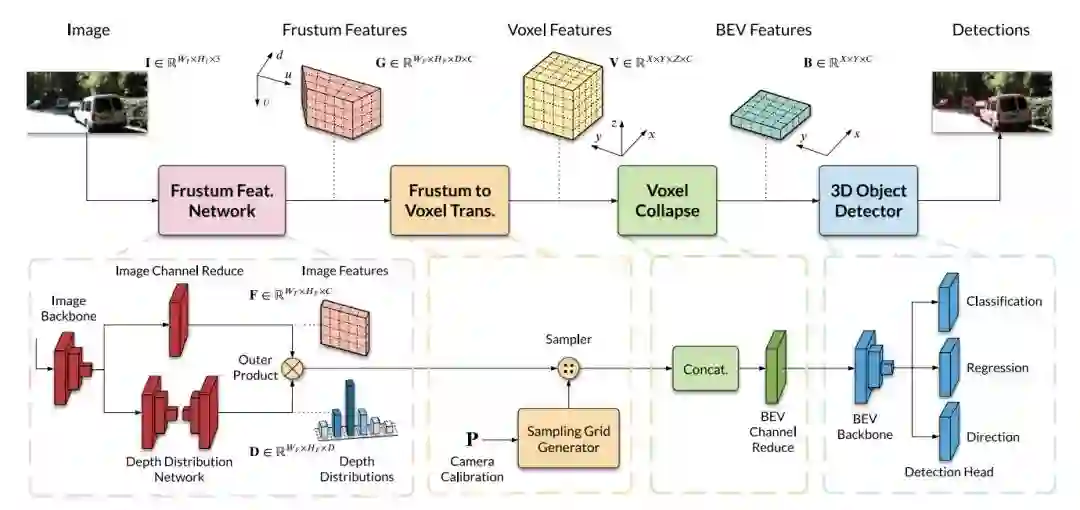单眼3D对象检测是自动驾驶汽车的关键问题,因为与典型的多传感器系统相比,它提供了一种具有简单配置的解决方案。单眼3D检测的主要挑战在于准确预测物体深度,由于缺乏直接的距离测量,必须从物体和场景线索中推断出物体深度。许多方法尝试直接估计深度以辅助3D检测,但是由于深度不准确,结果显示出有限的性能。本文提出的解决方案分类深度分布网络(CaDDN)对每个像素使用预测的分类深度分布,以将丰富的上下文特征信息投影到3D空间中的适当深度间隔。然后,使用计算效率高的鸟瞰图投影和单级检测器来生成最终的输出边界框。本文将CaDDN设计为用于联合深度估计和对象检测的完全可区分的端到端方法。