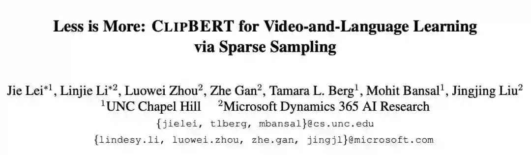 标题: Less is More: CLIPBERT for Video-and-Language Learning via Sparse Sampling