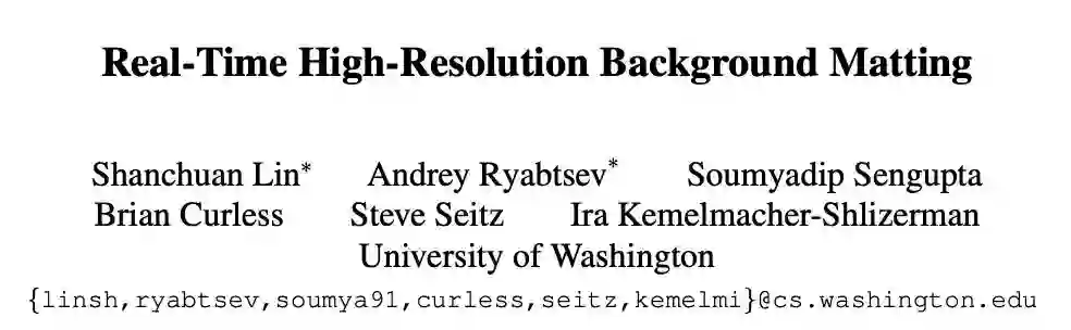 本文介绍了一种实时,高分辨率的背景替换技术,该技术可在4K分辨率下以30fps的速度运行,而在现代GPU上以60fps的高清速度运行。本文技术基于背景遮罩,其中捕获了背景的附加帧,并用于恢复alpha遮罩和前景层。主要挑战是要计算出高质量的Alpha遮罩,并保留股级头发细节,同时实时处理高分辨率图像。与以前的背景抠像技术相比,该方法产生了更高的质量结果,同时在速度和分辨率上都取得了巨大的进步。
