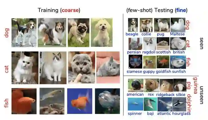在这些实际应用中,预先训练的标签空间无法保持固定以有效使用,并且需要对模型进行“专业化”以即时支持新类别。稀疏到极少的射击(C2FS)是一种特别有趣的场景,基本上被鲜为人知的文献所忽略,其中训练班(例如,动物)的粒度比目标(测试)类的“粒度更粗”(例如品种)。本文介绍了一种新颖的“角度归一化”模块,该模块可以有效地结合监督和自我监督的对比预训练来解决建议的C2FS任务,从而证明了在多个基准和数据集上的广泛研究中所取得的显著成果。