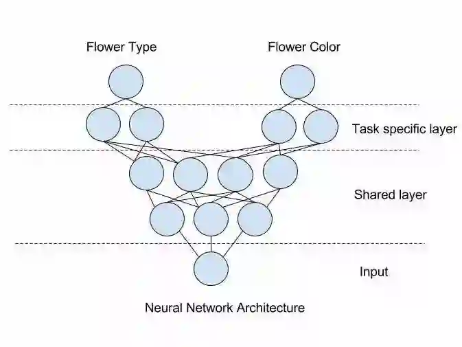 在上图中,隐藏的节点称为“共享层”,因为这些层的重要性对于这两个任务是相同的。然后,我们有“任务特定层”,其中分别执行与每个任务相关的计算,而不在层之间共享参数。在这些任务特定的层中,特定的神经网络学习特定任务的信息。这些独立任务层中的每一个节点都有不同的输出。在此例子中,一个节点预测花朵为玫瑰或雏菊,另一个预测花的颜色是红色、粉红色或白色。