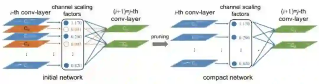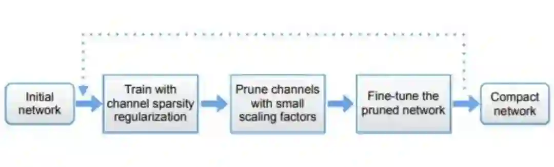 由于最终推理设备是cpu,所以对模型的轻量化要求较高,未经优化的yolov5s的推理速度越10FPS+,很难达到实时推理,所以我们对yolov5s网络进行剪枝,方法参考了slim-yolov3,通过bn层缩放系数,对模型各层的通道数进行结构化剪枝。剪枝的原理和操作流程如下: