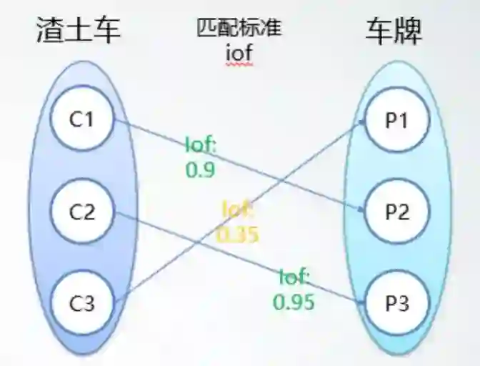 由于检测网络同时输出渣土车和车牌的bbox,丢失了两者的关联关系,所以我们使用匈牙利算法对两者进行匹配,获得每个渣土车目标对应的车牌bbox。匹配的cost使用的是IoF,即Intersection over foreground,车牌即为foreground。理论上,车牌对于其所在的渣土车的IoF应该为1,实际匹配中我们设置了一个更宽松的阈值0.8。主要处理流程如下: