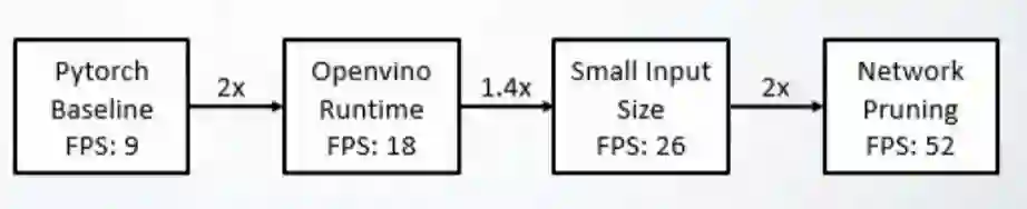 优化后模型的推理速度从9FPS最高到52FPS,已具备CPU上实时推理的能力。