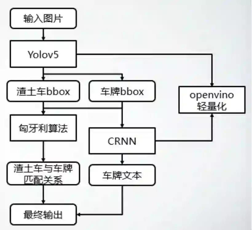 其中检测模型我们选用了yolov5s网络,该网络具有较好的精度和速度的trade-off,常用于落地部署项目中。该检测网络直接使用数据标注的渣土车和车牌类进行训练,同时检出两类目标。最终输出中并不需要输出车牌框bbox,所以此处输出的车牌bbox仅用于提取车牌内容。