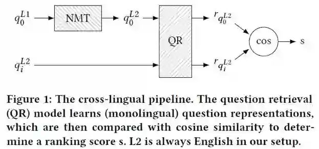 整体的pipeline如图1所示,给定问题q0首先由一个NMT神经翻译模型转换为L2语言,而后经过一个QR模型将翻译后的给定问题q0和待对比问题qi转换为向量表示,而后通过余弦相似度衡量两者的相关性。