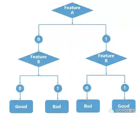 传统的子模型法为了控制数据泄露的风险,往往只能带少量样本的标签(Label)到其他企业建模,然后融合双方子模型的输出分获得最终决策,这就如同盲人摸象每次只能看到一个侧面,效果难以达到最佳。对于上述异或问题,子模型发现无论特征(Feature)是“0”还是“1”,标签分别是“Bad”和“Good”的比例都是差不多的,因此子模型的判断准确率只有50%,这和扔硬币方式的猜测差不多。相比之下,联邦学习可以建立如下图所示的决策树模型,有效地解决异或问题的判断,准确率从50% 提高到100%。