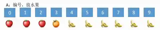 首先,由A进行如下操作:给盒子贴上编号,并按照财富值放入水果,放置规则如下:如果编号等于财富值的盒子放入橙子,编号小于财富值的盒子放入苹果,编号大于财富值的盒子放入香蕉。假设A 的财富是3 B$,则放置结果如图所示。