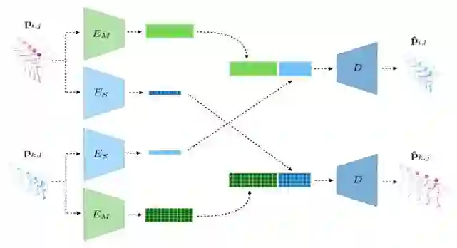 为了实现我们的目标,我们希望从视频中学习到一个与人体骨架(skeleton)和相机位姿(camera view)无关的高层的动作特征表示。方法的核心思想在于通过训练一个神经网络,将 2D 人体姿态序列分解成三个高层特征,分别表示人体动作、人体骨架和相机视角。特征分解之后,再重新组合,通过一个 decoder 解码成目标的 2D 人体姿态序列。