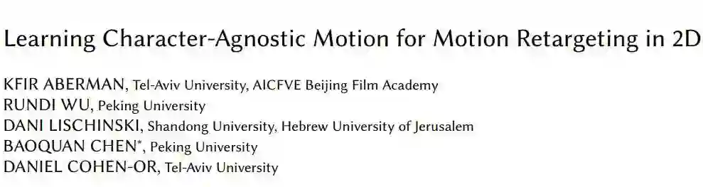 计算机领域规模最大、参与人数最多的顶级会议 SIGGRAPH 2019 将在今夏火热举行。北京大学陈宝权课题组与北京电影学院和山东大学合作共有 3 篇论文获得接收,另有一篇 ACM Transaction on Graphics 录用论文,共 4 篇论文将在 SIGGRAPH 上宣读。本篇为其中的一篇:《Learning Character-Agnostic Motion for Motion Retargeting in 2D》的解读。其他论文解读,敬请关注后续报道。