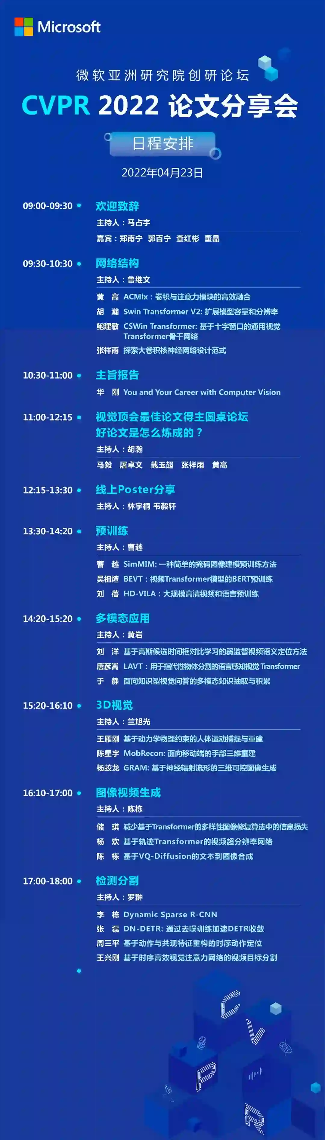 为了让更多感兴趣的朋友可以参与到精彩的CVPR 2022分享会中,同时也响应疫情防控政策,今年的 CVPR 论文分享会将在 B 站“微软中国视频中心”全程进行直播。