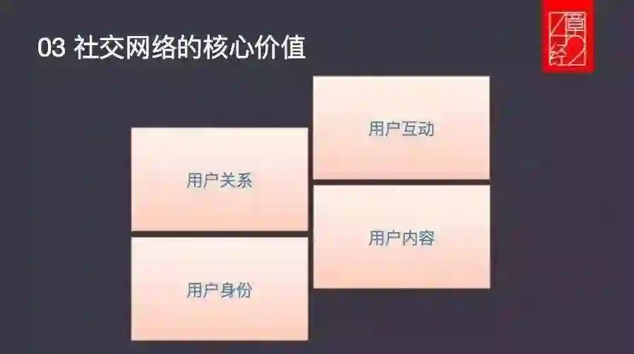 至于社交网络的核心价值我觉得有四个部分:首先用户进入社交平台,得给予用户一个身份(用户身份) ,有了身份之后让用户发布一些 UGC 内容(用户内容),进而和其它用户建立关系和互动(用户关系、用户互动)。