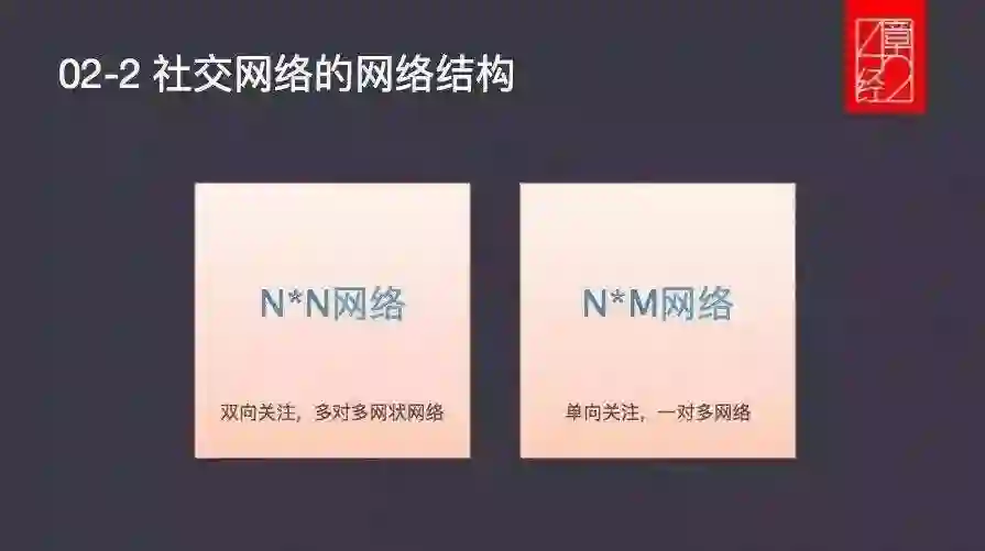 右边是N*M 网络,它更多的是单向关注,是一个一对多的网络。它的网络价值就是用户的数量乘以大 V 的数量。大部分的社交媒体和社区都属于 N*M 网络,比如微博,现在的快手、抖音。