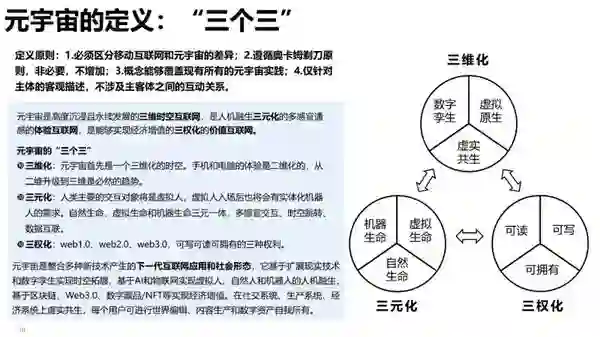 元宇宙是高度沉浸且永续发展的三维时空互联网,是人机融生三元化的多感官通感的体验互联网,是能够实现经济增值的三权化的价值互联网。
