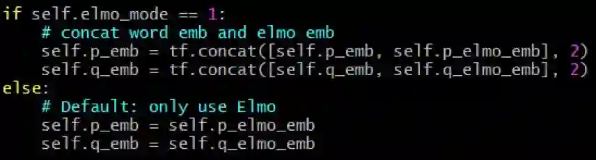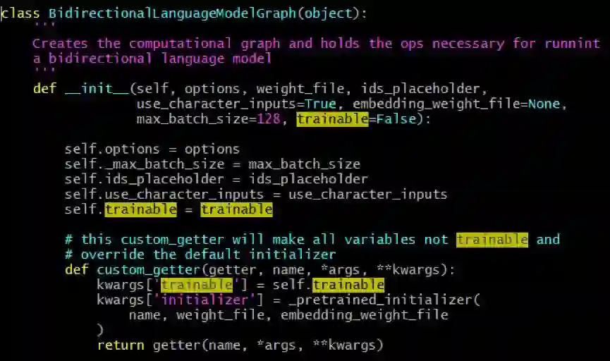 在 ELMo 代码中的,ELMo 中的参数都是预训练好的,所以在特定的 task 中,参数都是固定的。如果读者是希望用 task 数据更新 ELMo 所有的参数的话,是可以在 def custom_getter(.) 中做一些小修改 :