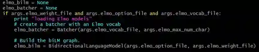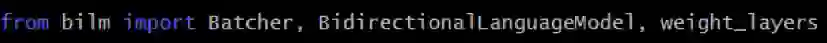 BidirectionalLanguageModel 就是那个双向的语言模型,weight_layers 就是用来合拼 bilm 中不同层的隐向量。下一步就是建立一个 BidirectionalLanguageModel 和 Batcher: