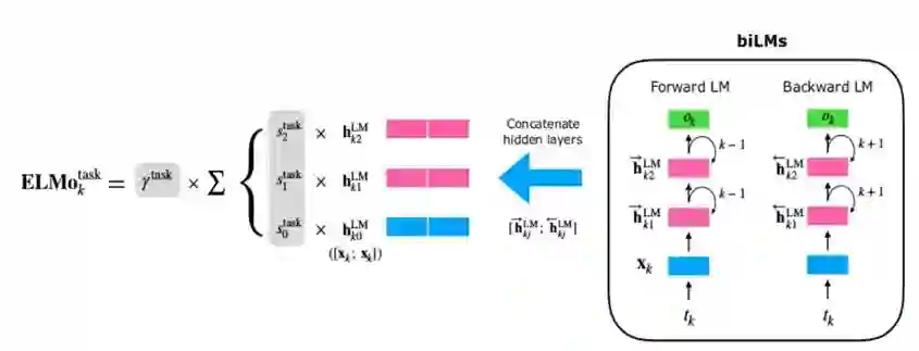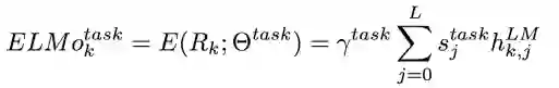 是反向 LSTM 第 j 层的输出向量。这 2L+1 个向量构成了计算 ELMo 的输入,最终第 k 个词的 ELMo 可以表示为它们线性组合: