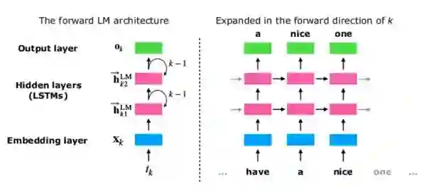 别是正反两个方向的 LSTM 的参数。图1. 向我们展示了一个基于双层 LSTM 的前向语言模型。