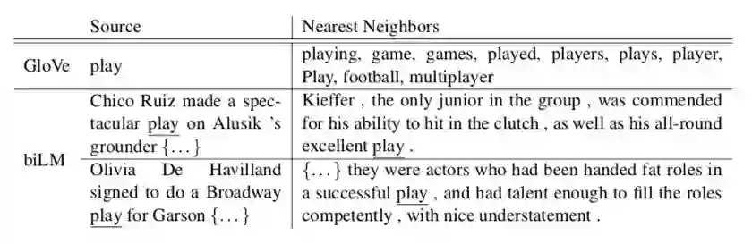如本文开头所述,在不同的上下文中,传统词向量的同一个词的表示是相同的,表 2. 的第一行展示了 “play” 这个词在 GloVe 向量中的最近邻的词,可以看到除了时态的变化之外,大多数都集中在运动相关的概念。而 ELMo 在不同的上下文中,对同一个词有不同的表示,表 2. 的下面两行展示了在不同的上下文中,ELMo 向量相近的 “play” ,可以看到,第二行两句都是运动相关,而第三行两句都是剧目相关。这个例子说明 ELMo 确实可以学到包含更多上下文的词向量。
