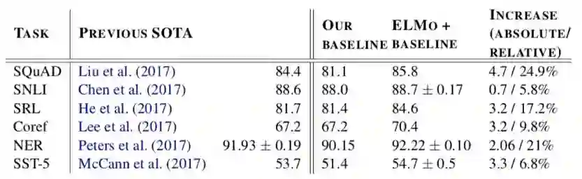 本篇文章作者做了很扎实的实验,在 6 个主流的 NLP 任务上使用了 ELMo ,均在当前的 SOTA 效果上得到了进一步提升,目前 ELMo 已经逐渐成为了阅读理解等任务中的标准组件。详细的实验数据见表 1.