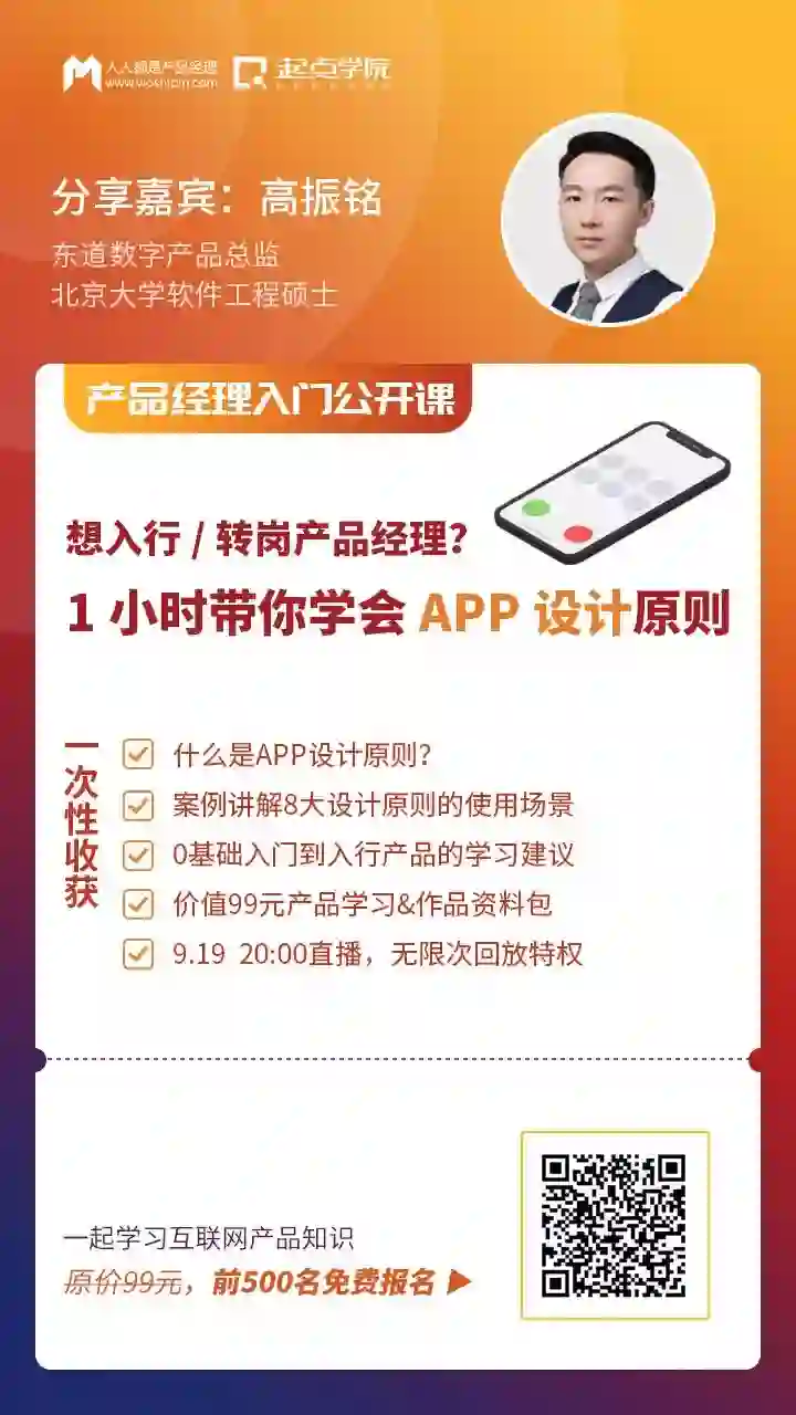 从用户中延伸出的APP设计原则有很多,在此就不赘述了。为了帮助更多0经验产品新人快速了解产品设计知识,人人都是产品经理社区&起点学院特邀东道数字产品总监,北京大学软件工程硕士@高振铭老师,用1个小时的时间,跟大家聊聊产品新人不得不知的产品设计常识。
