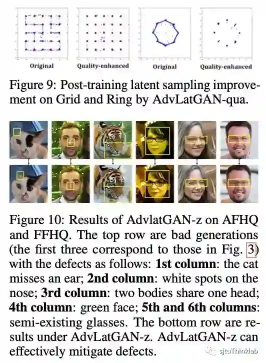 上图分别在仿真Grid/Ring数据和AFHQ数据集上可视化了生成样本在采样变换前后的差异,AdvLatGAN-z能够有效地提升生成质量,能够避免生成图像上的明显缺陷。