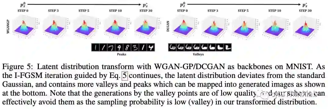 其次给出隐空间采样变换的具体方法。在GAN算法中判别器 被训练以区分生成分布和真实分布,因此其输出可被自然地选以量化生成质量。考虑隐空间采样变换的目标,即通过隐变量上的扰动以造成判别器网络输出的显著变化,我们自然地求诸对抗样本方法来实现采样变换。具体而言,我们在固定生成器 和判别器 参数条件下采用I-FGSM方法更新隐变量来最小化生成器损失,优化目标如下: