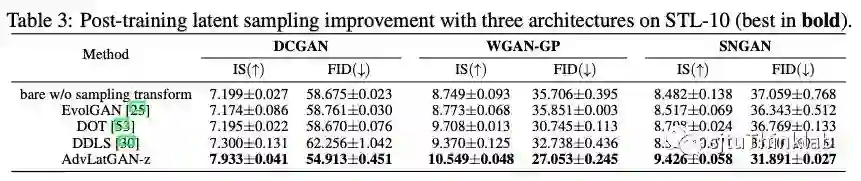 上表对比了其他GAN采样优化方法在不同GAN算法上的表现,AdvLatGAN-z显示出明显的优势。