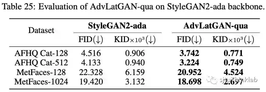 上表展示了AdvLatGAN-qua(+)/div(+)在八种主流GAN模型上的有效性,验证的数据集包括Cifar-10、STL-10、LSUN、CelebA、ImageNet、AFHQ以及MetFaces,在数值结果上,我们的方法在各种场景下均存在显著提升,提升幅度最高达到50%。