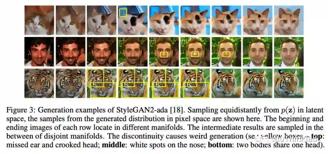 作为经典的生成范式之一,GAN使用经过生成器网络映射后的高斯分布来拟合真实数据分布。然而,由于生成器作为神经网络本质上是一个连续映射,连续隐空间分布经过生成器映射得到的生成数据分布也将是连续的,而自然图像分布支撑在多个不连接的流形上[4],这使得生成数据分布难以与真实数据分布保持一致,这也对应着生成场景下采样空间往往包含一些invalid generation的现象。如下图所示,在隐空间中等距采样,采样跨越不同不连接流形时,生成结果将不可避免地包含invalid generation。