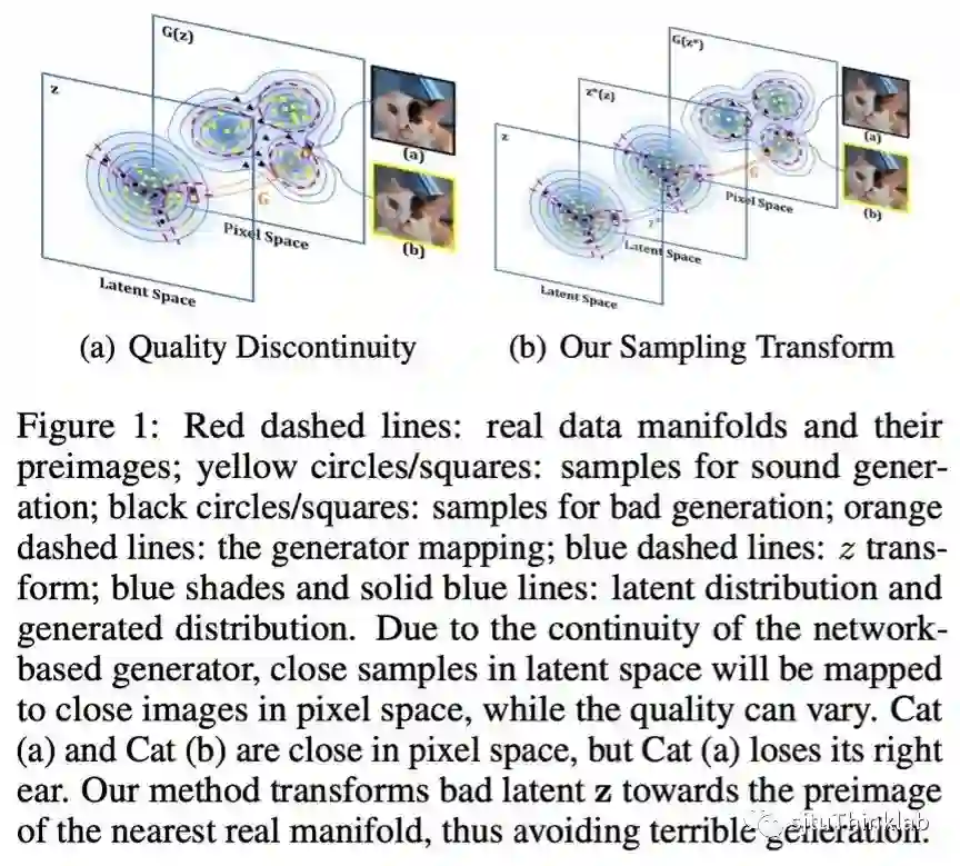 本文提出对隐空间上施加隐式采样变换,示意图如下。我们希望通过采样变换使得对应于真实图像流形外的采样(即invalid generation)可被迭代优化到有效的采样空间中。