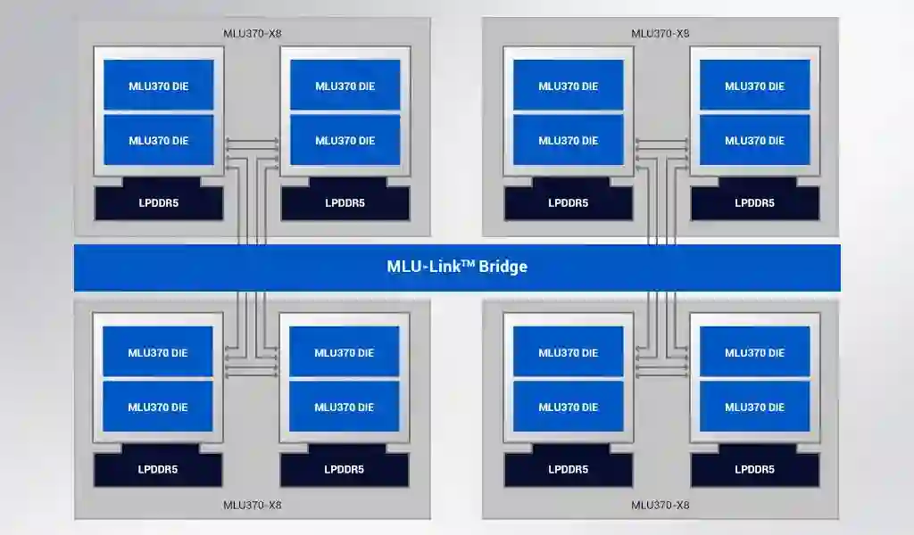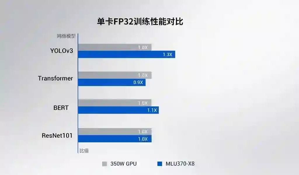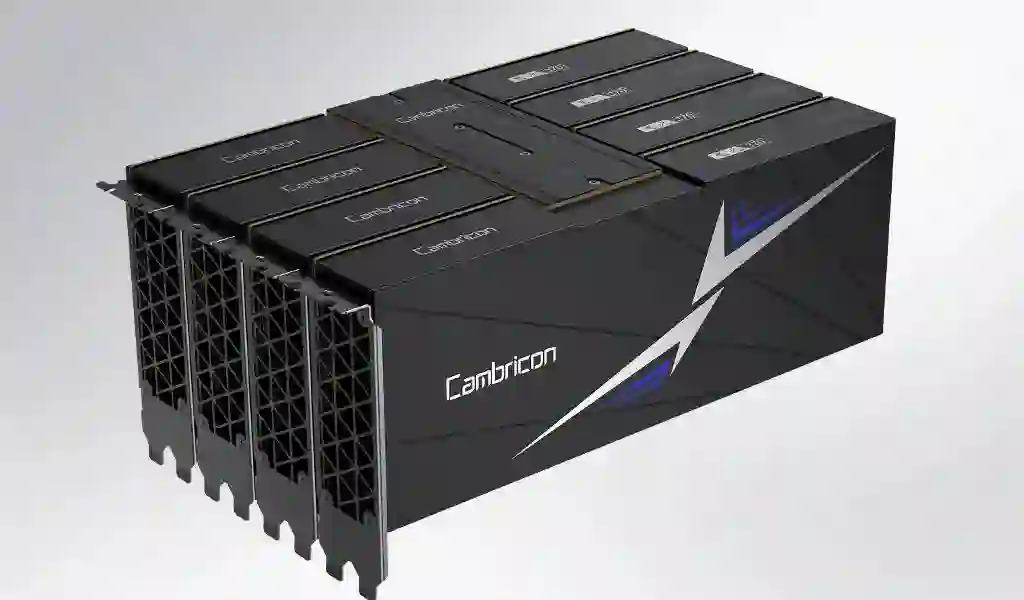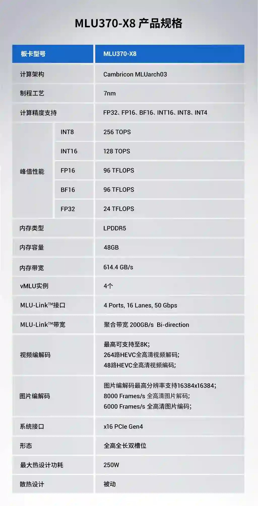 2022年3月21日,寒武纪正式发布新款训练加速卡MLU370-X8。MLU370-X8搭载双芯片四芯粒思元370,集成寒武纪MLU-Link™多芯互联技术,主要面向训练任务,在业界应用广泛的YOLOv3、Transformer等训练任务中, 8卡计算系统的并行性能平均达到350W RTX GPU的155%,并已实现商业化部署。