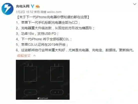 根据充电头网的爆料,苹果下一代iPhone将告别多年来的5W充电头,换上全新的支持PD协议的18W快充头。iPhone的标配充电头外观也会有所改变,不但体积更大,还会升级为椭圆形。下一代新充电头将采用Type-C接口,标配的数据线也将从现在的Type-A转Lightning变成Type-C转Lighnting。