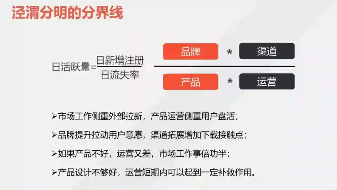 市场工作侧重拉新产品作用,产品运营工作侧重用户的盘活。品牌提升是可以拉动用户转化成为用户的意愿,而渠道恰恰是增加用户和产品的接触点。