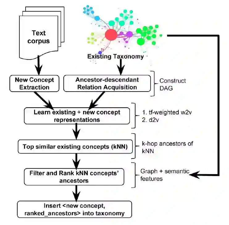 本文的主要挑战是找到一个计算度量,它能够代表图谱中独立于语言和领域的语义逻辑,将新概念插入到知识结构,不破坏之前网络的语义完整性关系。算法面向已存在的概念框架和新的概念,学习了一个高维的词向量。用于对比新概念和相邻概念之间的相似度,来预测这种潜在的链接新旧概念之间的父子关系,为了解决这个挑战,本文将高效图论特征和利用额外知识的语义相似度特征进行结合。其中选取了大量的图特征和语义特征:Katz相似度,RandomWalk Betweenness Centrality(如果想尝试更多的中心度量特征,可参考论文《Unsupervised graph-based topic labelling using dbpedia》),PMI等