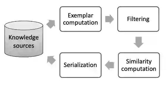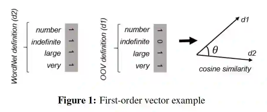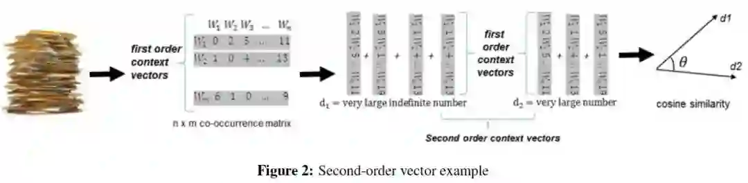 一阶向量由候选集与新实体定义中关联单词出现的次数构成,利用余弦相似性来量化相似程度。但缺点是向量矩阵过于稀疏。因此在二阶向量度量中,为定义中的每个单词创建一个向量,其中包含其在外部语料库中共现的单词,将词向量平均值作为新实体和候选集的二阶向量。