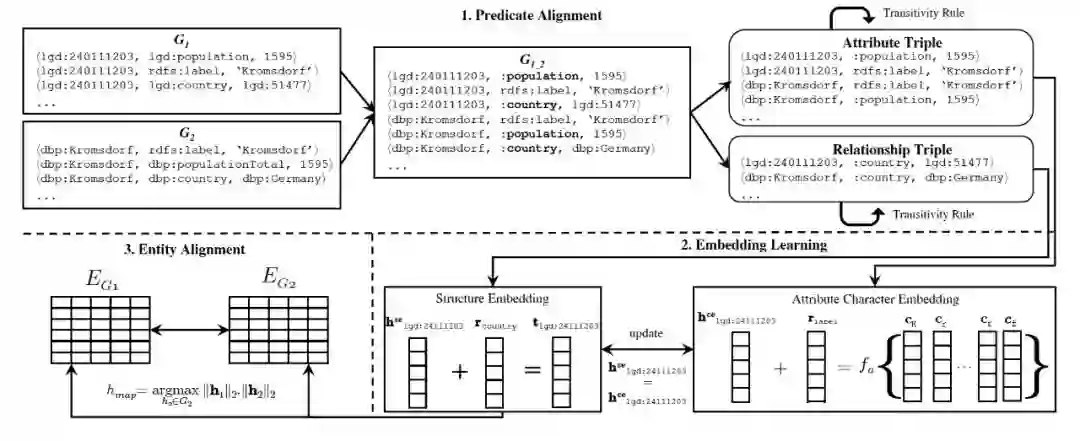 不同于TranE和PTransE等模型,学习实体或者路径,本文还考虑了图谱中的实体属性值,进一步丰富了实体的语义环境。算法分为三个部分:谓词对齐、知识表示学习和实体对齐。