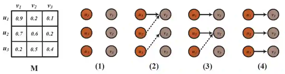 假设有三个源实体u1,u2,u3和三个目标实体v1,v2,v3。给定融合相似度矩阵M,其中实体对应行/列中的值表示其偏好(首选较大的值)。源实体按照偏好矩阵,依次向目标实体进行对齐。