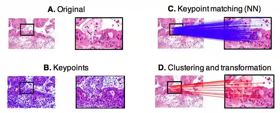 检测复制-移动重用。A.癌变细胞和缩小部分的原始例子。B.关键点(高熵区域)的计算C.最近邻匹配。D.集群关键点、跨集群匹配和仿射变换。